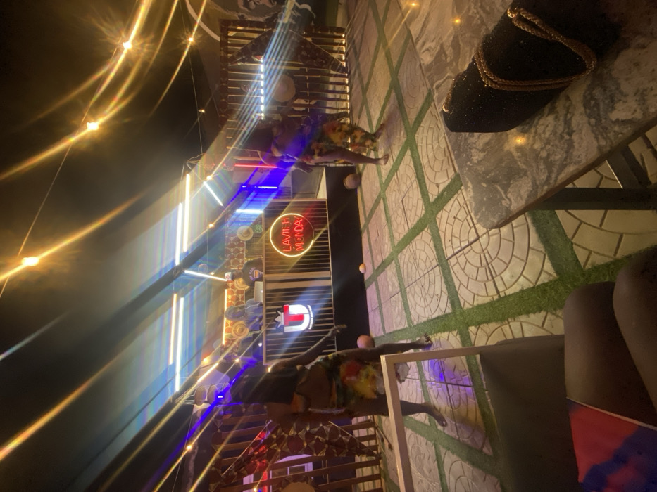 An outdoor patio area featuring tiled flooring interspersed with patches of artificial grass. Overhead, string lights and neon signs, including one that reads "La Vie En Moda", illuminate the space. People are visible seated or standing near tables and chairs. A purse with gold detailing sits on a table's edge, and a partial view of a chair is at the bottom right. The overall ambiance suggests an evening setting in a trendy outdoor lounge.