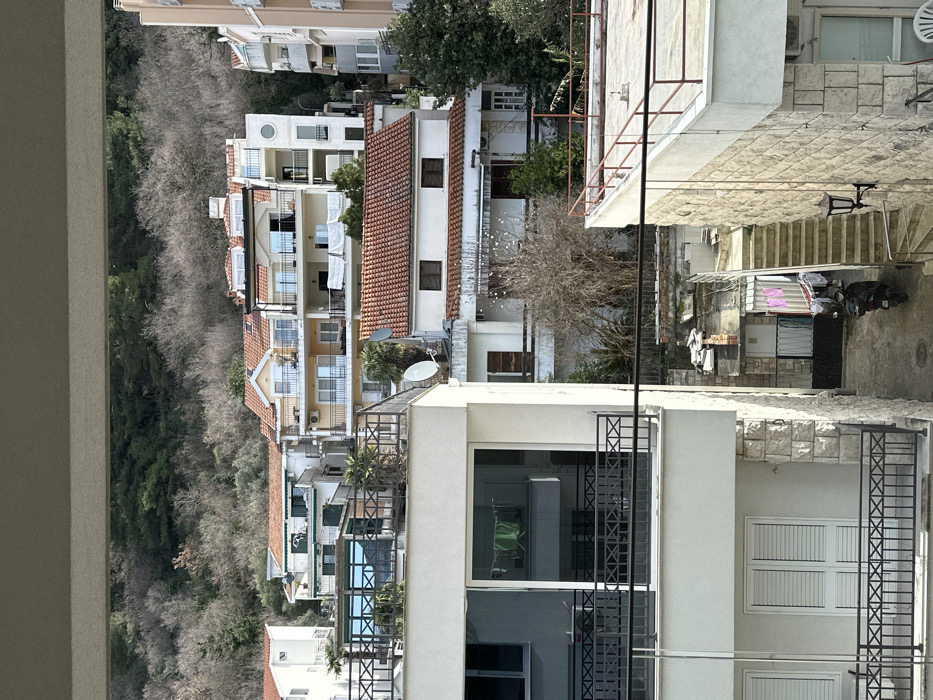 This image depicts a dense residential area on a hillside in Budva, Montenegro, viewed from an elevated position