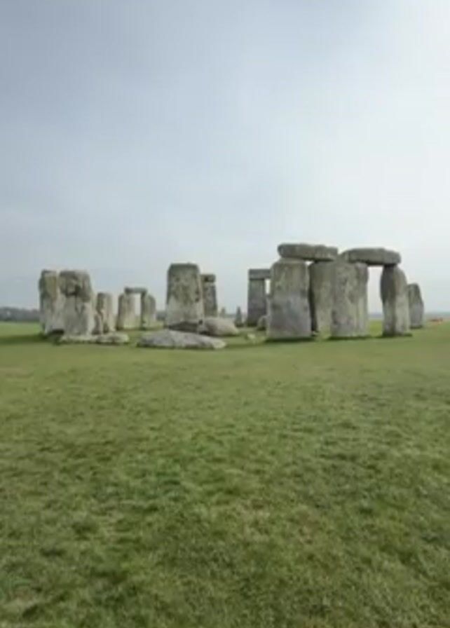 The video presents a wide shot of Stonehenge, set against a backdrop of a grey, overcast sky and sprawling green fields