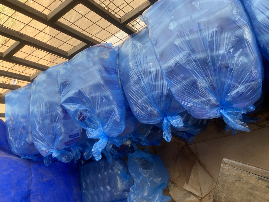 The image captures an indoor storage area in Okura, Nigeria, dominated by a large accumulation of packaged water products