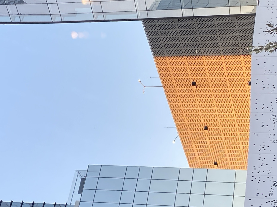 This image captures a modern urban landscape under a clear, bright blue daytime sky, characteristic of the Angelópolis district in Puebla City, Mexico. The scene is dominated by three architectural structures. On the left, a tall, multi-story skyscraper with a reflective glass facade composed of rectangular panels is partially visible; its rooftop features a visible railing and obscured furniture. On the right, a second, similarly modern glass-faced skyscraper is partially visible, reflecting ambient light. Centrally positioned, a large, rectangular building or structure presents a distinct orange-brown, perforated facade, textured with a grid pattern of small holes. The left portion of this central structure is brightly illuminated by direct sunlight, while the right portion falls into shadow, appearing a darker grey. Two streetlights with dual lamp heads and several thin, dark spires protrude from its rooftop. Four dark, rectangular fixtures are mounted on the illuminated section of its facade. In the lower foreground, a white wall with an irregular pattern of small, dark, rectangular perforations runs across the frame. Blurred green foliage, possibly from a shrub, is visible in the lower right foreground, partially obscuring the white wall. No individuals or discernible activities are present.