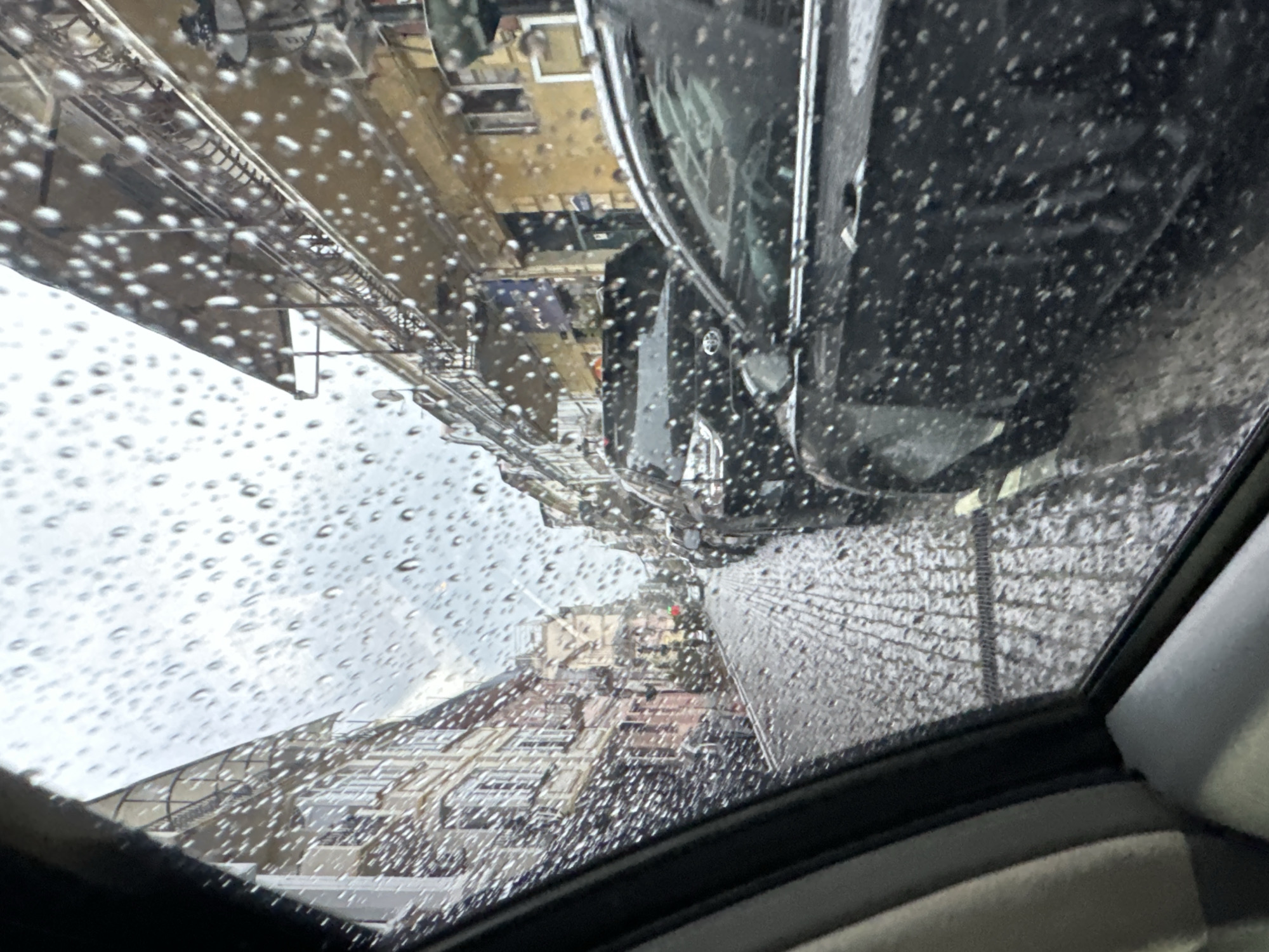 The image is taken from inside a car, looking out through a sunroof covered in raindrops