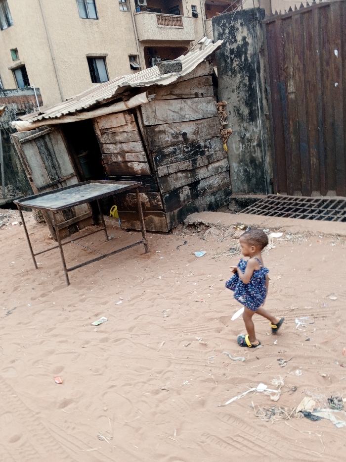 The scene depicts a street or open area in Onitsha, Nigeria, characterized by reddish-brown sandy ground. **Structures:** To the left and center, a small, dilapidated, rectangular shack constructed from weathered wooden planks stands, featuring a corrugated metal roof. A stone or concrete block rests on the roof. Its single door is partially open, revealing a dark interior. A dark metal table with an exposed frame is positioned on the sand in front of the shack. Behind the shack, a multi-story, light-colored building with multiple windows and balconies is visible. To the right of the shack, a tall, rusted corrugated metal gate or wall is present, adjacent to a concrete pillar exhibiting dark staining. A metal grate, likely a drain cover, is visible at the base of the gate. A yellow plastic object is located near the shack's entrance. **People:** A young child, appearing to be a toddler, walks from right to left across the sandy foreground. The child has short, dark hair and is wearing a dark blue patterned dress with thin straps and yellow and black open-toed sandals. No other individuals are visible. **Environment:** The ground consists primarily of loose, reddish-brown sand, showing various footprints and tire tracks. Scattered litter, including plastic wrappers and miscellaneous debris, is visible across the sandy surface.