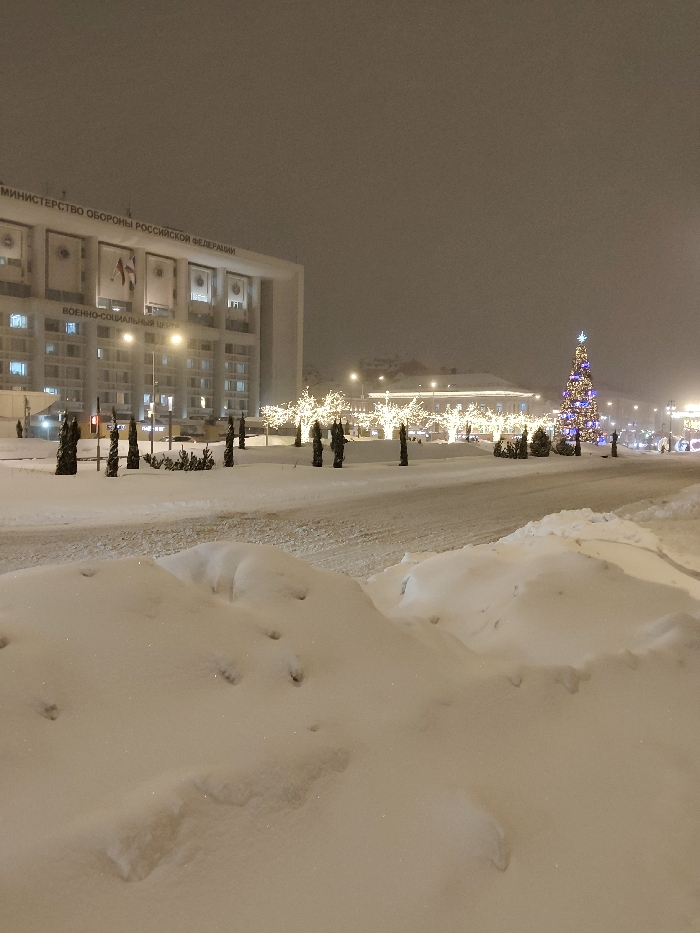 A snowy cityscape at night features the Ministry of Defense of the Russian Federation building on the left. A line of trees with lights and a brightly lit Christmas tree stand across the street. The foreground shows large piles of snow, possibly from snow removal, with visible footprints. The sky is dark, indicating nighttime, and the scene is illuminated by streetlights and decorative lights.
