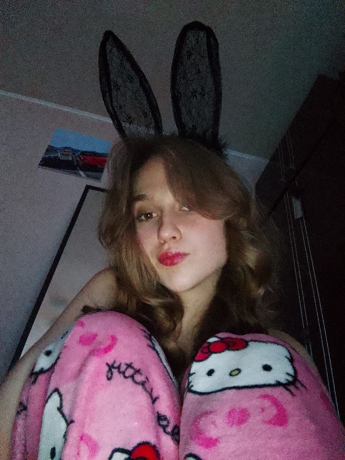 A young woman with wavy brown hair and red lipstick wears black lace bunny ears. She is wearing pink Hello Kitty pajama pants. Behind her is a framed picture of cars and a dark-colored cabinet. The photograph is taken at an upward angle.