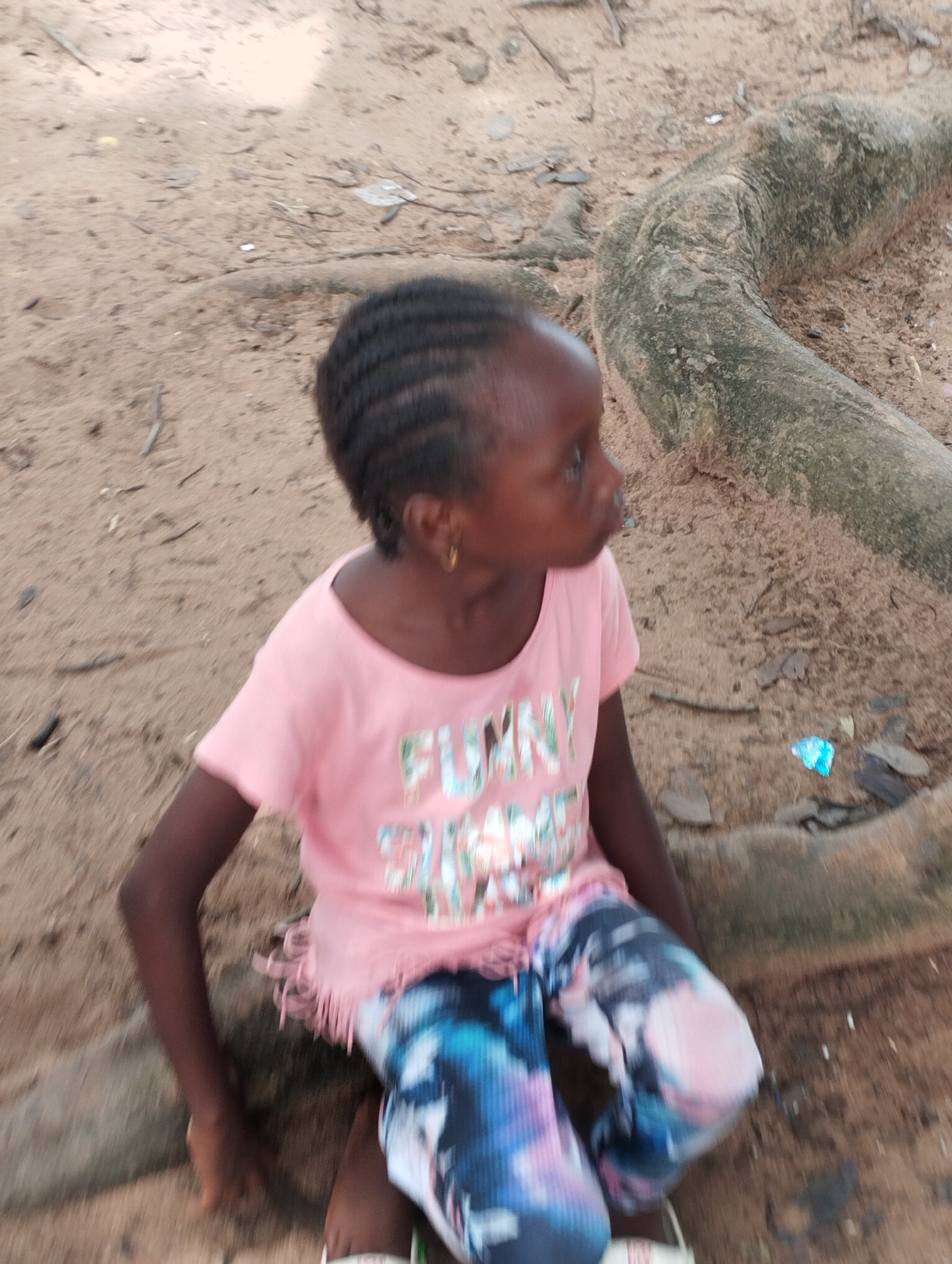 A young girl is sitting outdoors in Ihiagwa, Nigeria. She has short, braided hair and is wearing a pink t-shirt and blue and white patterned pants. She is sitting on or next to a large, exposed tree root. The ground is sandy and there are scattered leaves and debris around. A small piece of blue trash is visible near the tree root. The girl is looking off to the side.