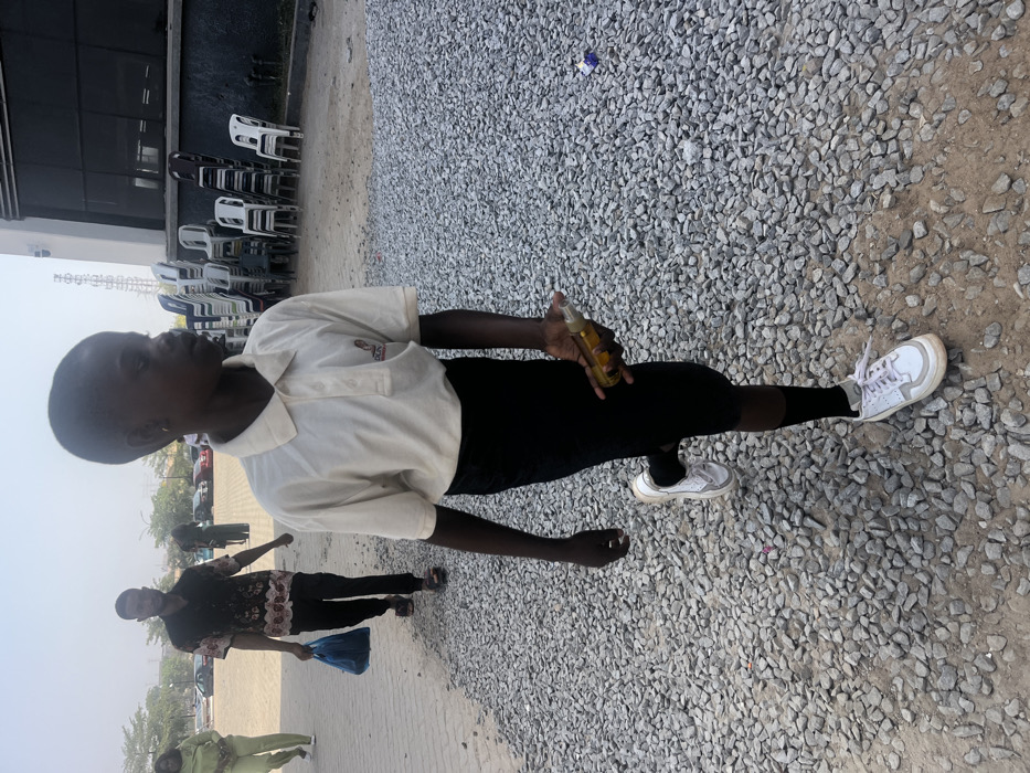 An outdoor scene in Iddo Tudunwada, Nigeria, depicts a young individual walking across a gravel-covered area under bright daylight