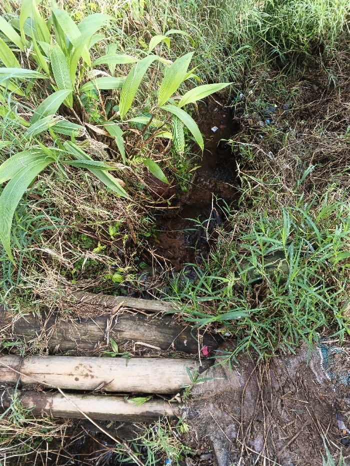 A small stream cuts through dense foliage and grassy overgrowth. Tall, slender plants with broad leaves cluster to the left of the water. Debris litters the stream's edge. In the foreground, two roughly hewn logs form a makeshift bridge or path. Muddy soil surrounds the logs on the right, contrasting with the verdant vegetation.