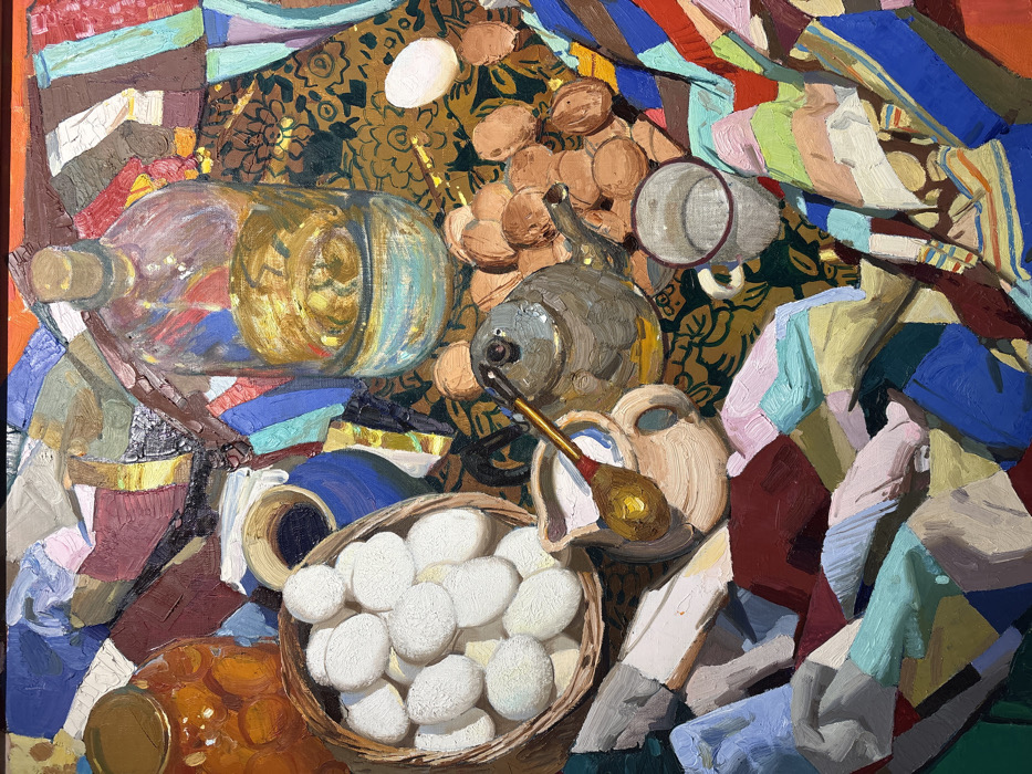This oil painting, executed in a distinct impasto style, depicts a still life arranged on a textured surface, characteristic of a domestic setting in the city of Voronezh, Russia. The scene features a collection of everyday objects and food items. In the upper left, a glass jar with a golden lid contains an amber-colored, viscous substance. Below it, a woven basket overflows with approximately two dozen white chicken eggs. To the right of the basket, a small, dark blue ceramic jug with a wide mouth is visible. In the upper right quadrant, a tall, clear glass bottle, sealed with a cork, holds a yellow liquid, likely cooking oil, filling roughly half its volume. To its immediate right, a single white chicken egg rests directly on the underlying fabric. The central area includes a small, light-colored ceramic pitcher containing a white liquid, presumably milk or cream, with an ornate spoon featuring a gold-colored bowl and red-tipped handle immersed within it. Adjacent to the pitcher, a dark, metallic teapot with a spout and handle is positioned. To the right of the teapot, a cluster of approximately two dozen brown chicken eggs is scattered. Below the teapot, an empty, light-colored metal or enamel cup with a red rim and handle is present. All objects are displayed on a dark, patterned textile, possibly a tablecloth, adorned with intricate golden or yellow floral and geometric motifs. This textile is partially overlaid and surrounded by numerous fragmented pieces of brightly colored fabric scraps or textiles, creating a vibrant patchwork pattern across the composition, incorporating shades of blue, red, brown, green, pink, and off-white. No people are depicted, and no actions or interactions are occurring within the static arrangement.