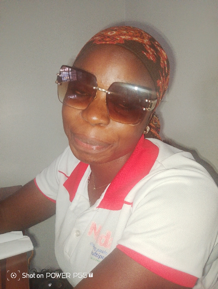 A woman with brown skin wears a patterned headscarf and oversized, gold-rimmed sunglasses. She has a slight smile. She is wearing a white polo shirt with red trim and a small logo visible on the left side. A gold necklace is visible around her neck. A desk is partially visible in the lower left corner of the frame. A watermark at the bottom says "Shot on POWER P55T".