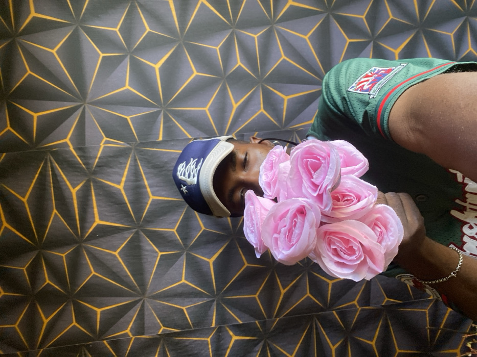 A man wearing a navy blue baseball cap, green shirt and silver bracelet is seen from an aerial perspective, lying on a dark gray surface with gold geometric patterns. He is holding a bouquet of pink roses near his face. The cap has white lettering and a white brim. The shirt has an emblem on the sleeve. The surface texture is textured and appears to be wallpaper or paneling.