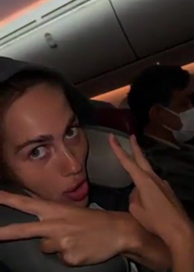 A young person with light brown hair, wearing a gray hoodie and a neck pillow, is on an airplane, making peace signs at the camera. A man with a dark complexion and black hair is sitting next to the person, wearing a white face mask and using his phone. The camera pans to show the screen on the back of the seat, where an interactive menu is being displayed. The interior of the airplane is lit with a soft orange light.