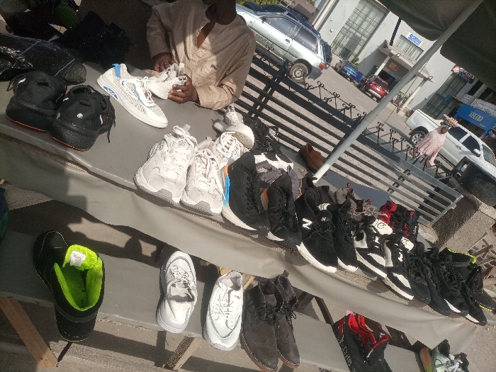 The image captures an outdoor commercial scene in Jalingo, Nigeria, centered on a street-side footwear stall