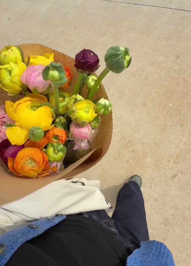 person's lap, holding a bouquet of colorful flowers wrapped in brown paper. The flowers are a mix of yellow, orange, pink, and purple, some in full bloom and others still as buds. The person is wearing jeans, a black shirt, a white top, and a blue denim vest. One gray boot is visible. The background is a beige sidewalk. The camera angle is looking down from above.
