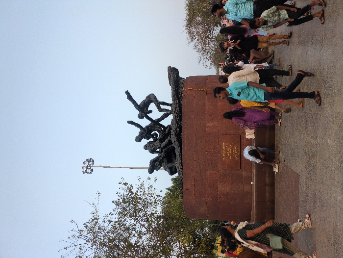 The image displays the "Triumph of Labour" statue, located on Marina Beach in Chennai, India