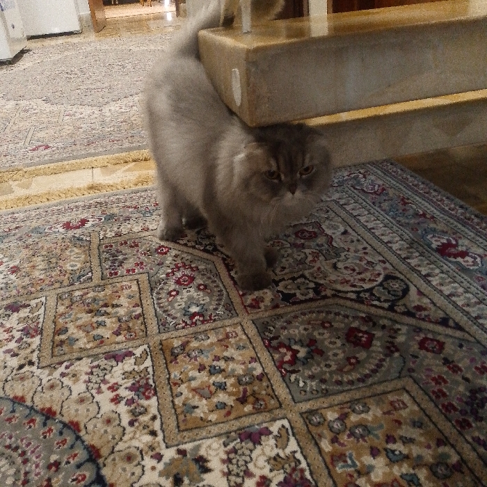 - "The image displays a long-haired, grey-furred cat standing on an ornate patterned rug within an indoor environment" by FM-o4pOG2, licensed under CC BY 4.0
