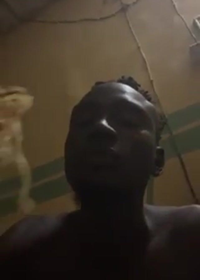A shirtless, dark-skinned man is eating spaghetti from a fork in a poorly lit room. The walls are yellow with green stripes and wires run along the ceiling. The man is looking directly at the camera.