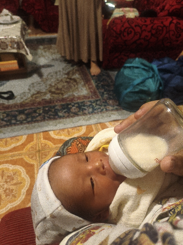 This indoor image, captured in Pacet, Indonesia, depicts an infant being bottle-fed
