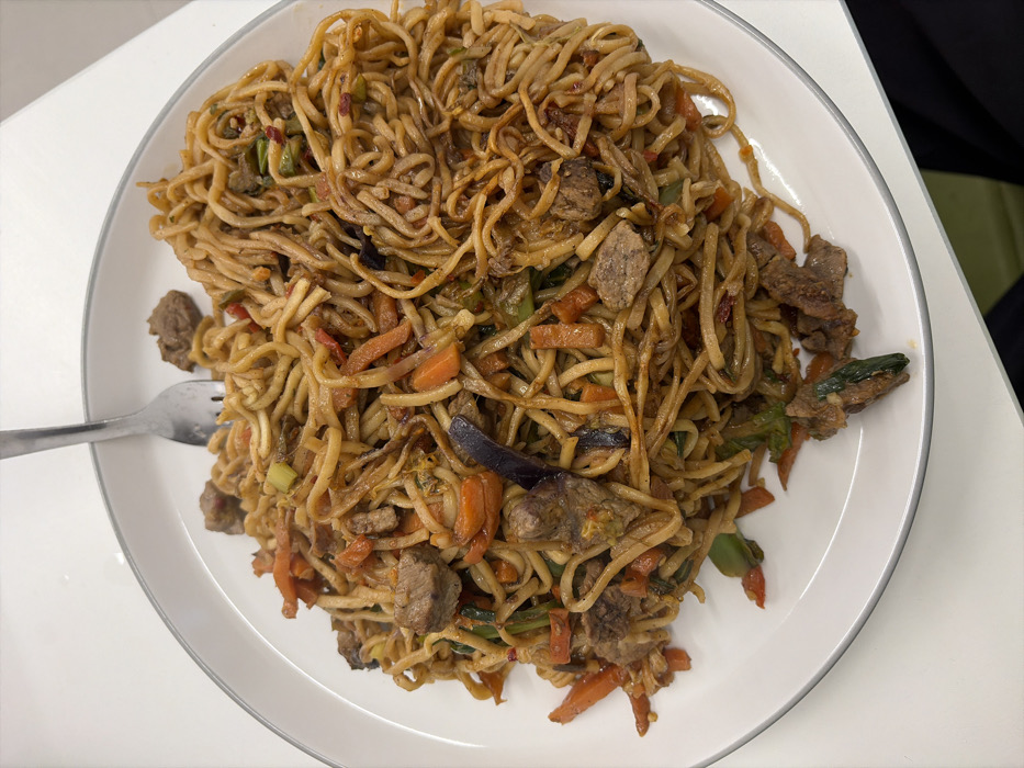 A white, oval-shaped ceramic plate, featuring a thin dark grey rim, is centrally positioned on a light-colored, uniform surface, likely a tabletop. The plate is filled with a portion of stir-fried noodles mixed with vegetables and meat. The noodles are light brown and tangled, coated in a dark, glossy sauce. Visible vegetables include orange julienned carrots, green pieces (possibly bell peppers or scallions), and dark purplish irregular pieces (possibly eggplant). Scattered throughout the noodles are irregular chunks of browned meat. A silver-colored metal fork is inserted into the upper left quadrant of the noodles, with its tines partially submerged. The background consists of the light-colored surface, with a faint shadow on the right side of the plate. In the lower right corner, a dark fabric and a small area of a light green object are partially visible. The scene is located in New Forest, United Kingdom.
