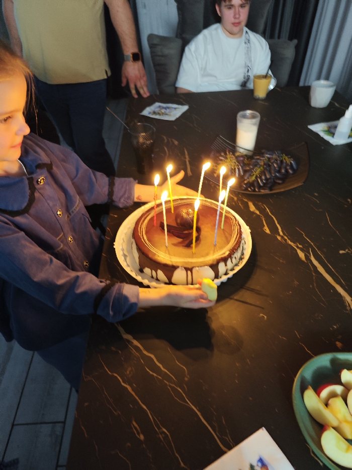 The scene depicts an indoor domestic gathering around a dark, marble-patterned dining table. The specific location within the city of Unknown, Unknown, is undetermined. In the foreground, a young female child, estimated 6-10 years old, wearing a dark blue long-sleeved jacket with golden buttons and a black collar, stands or sits with her head in profile, facing left. Her hands are positioned near a round chocolate cake on a white ruffled stand. The cake features a darker top layer with a swirled chocolate decoration and white frosting drips down its sides. Eight to nine yellow and white candles are lit on the cake. The child's right hand holds a small, yellow-green object, possibly a fruit segment. A faint reddish mark is present on her right forearm. To the left and slightly behind the child, an adult male is partially visible, standing. He wears a light brown shirt and dark trousers, and his right hand, resting on the table, displays a smartwatch with a dark face and a silver-colored band. To the right of the child, a young adult male is seated at the table. He has light brown hair and wears a white t-shirt with a black and white strap across his chest. He is looking towards the left. In front of him, a glass with a handle contains a light brown beverage. Additional items on the table include: a dark black platter holding dark grapes, a clear glass containing an opaque white liquid, a dark patterned glass containing a dark liquid, a white ceramic mug, and two small white napkins with a purple floral design. In the lower right corner, a teal bowl contains several slices of light-colored fruit, identified as apples, some showing signs of oxidation. A small, colorful card is partially visible below the apple bowl. The background shows dark upholstered furniture and light-colored window coverings. The flooring visible in the lower-left corner is light-colored wood. The lighting appears artificial, with shadows cast by the objects and individuals on the table.