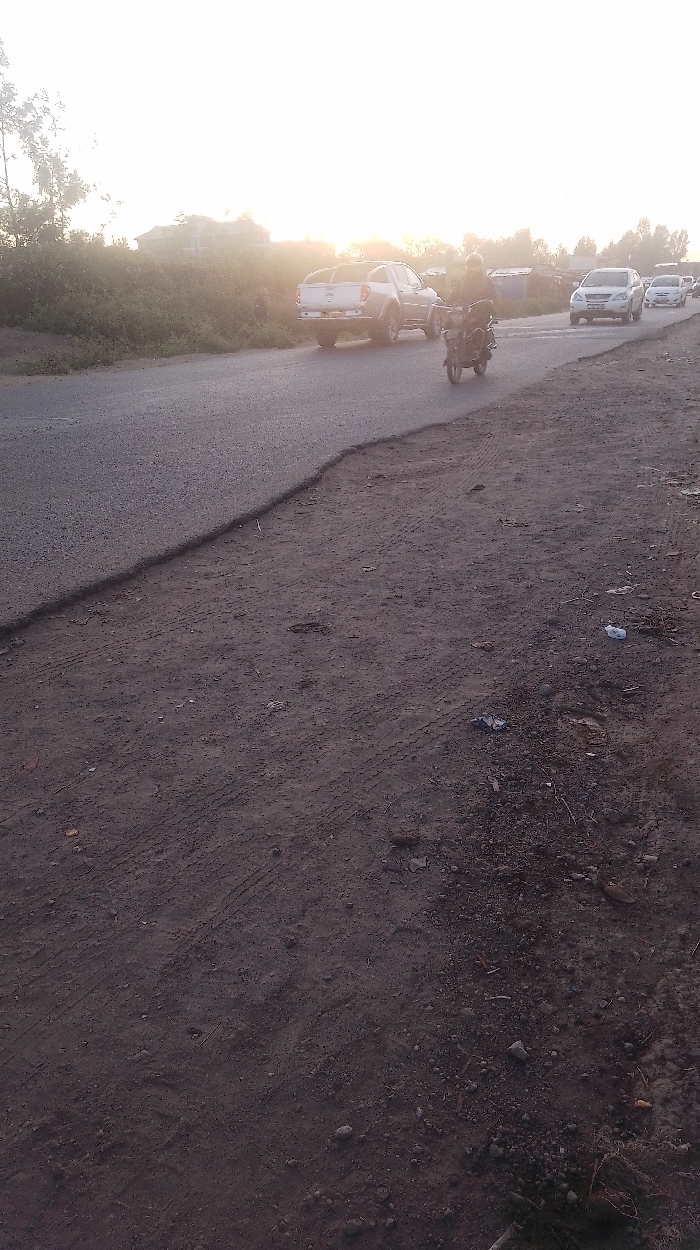 A sunlit street scene shows a dark asphalt road flanked by a dirt shoulder. Vehicles include a white pickup truck, a motorcycle, and cars further down the road. Trees and a building are visible in the background, partially obscured by the bright sunlight. The shoulder area features tire tracks and scattered debris. The image is captured from a low angle, emphasizing the texture of the dirt surface.