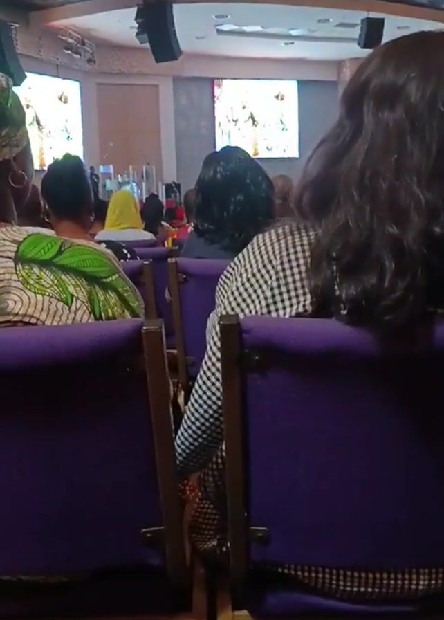 The interior of a large event space, possibly a church or conference hall, is shown from the back of the seating area. Rows of purple cushioned chairs are visible, occupied by attendees facing a stage. Two large screens on the stage display visuals of the event in progress. People are seated in front of the camera, including individuals with varying hairstyles and outfits. The ceiling is high with visible lighting fixtures and rigging for equipment.