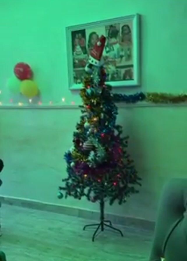 A cozy room is lit with a vibrant green hue, emanating from the ceiling lights. A decorated Christmas tree stands against the wall, adorned with colorful garlands and a Santa hat on top. A picture frame hangs above the tree, showcasing multiple photos. Three balloons - red, green, and yellow - are grouped near the door, contributing to the festive atmosphere. The room is furnished with a green armchair, a small yellow and green chair, and a peek of another chair near the frame's left edge. A little child is partially visible near the left edge of the frame. The camera slowly pans away from the tree, revealing more of the room.