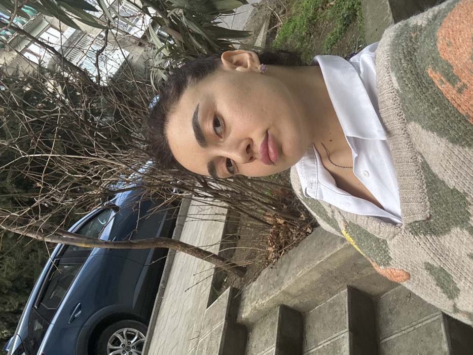 A young woman with dark hair pulled back, strong eyebrows, and full lips, wearing a white collared shirt under a V-neck knitted sweater with a beige, olive green, and peach pattern, is captured in a close-up, slightly upward-angled shot