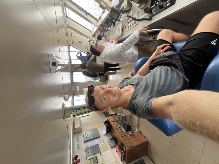 interior of a ship's bridge, likely navigating waters near Ketapang, Indonesia. In the immediate foreground, a young adult male with short light hair and sunglasses on his head smiles at the camera, holding it in a selfie orientation. He is seated in a blue upholstered chair and wears a grey short-sleeved t-shirt and black athletic shorts. To the right of the foreground subject, an adult male with dark hair and a white long-sleeved shirt stands beside a sophisticated control console. His right hand is near a circular steering mechanism, and the console features multiple electronic display screens, a white corded telephone, and various buttons and switches. In the background, on the left side of the bridge, a wooden desk is visible, equipped with a silver laptop, a black printer, and stacked documents. Wall-mounted panels with indicators and an air conditioning unit are also present. Further into the background, several other individuals are observed. An adult male in an olive green short-sleeved shirt stands near a woman with dark hair who is partially obscured. To their right and further back, another individual in a blue shirt is visible, seated with a hand raised towards their head. Large panoramic windows line the forward section of the bridge, offering a view of calm water. The bridge features a light-colored ceiling and floor.
