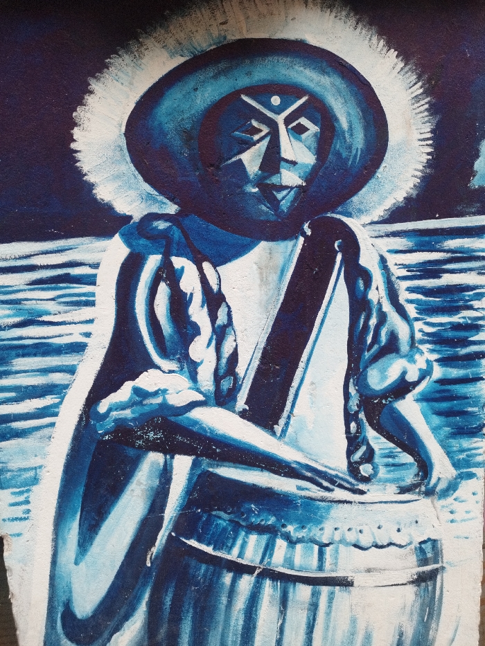 A stylized mural, predominantly rendered in shades of deep blue and white, depicts a human figure from the chest up. The figure wears a wide-brimmed hat with a textured white rim and possesses an abstract, mask-like face characterized by geometric shapes for features, including a vertical line and a central dot on the forehead. A broad, dark strap crosses the figure's chest diagonally. Both hands are placed on the top surface of a prominent, barrel-shaped drum, which features vertical staves and a scalloped decorative band near its upper rim. The background consists of horizontal blue and white wavy lines, indicating a body of water. This artwork is located in Montevideo, Uruguay.