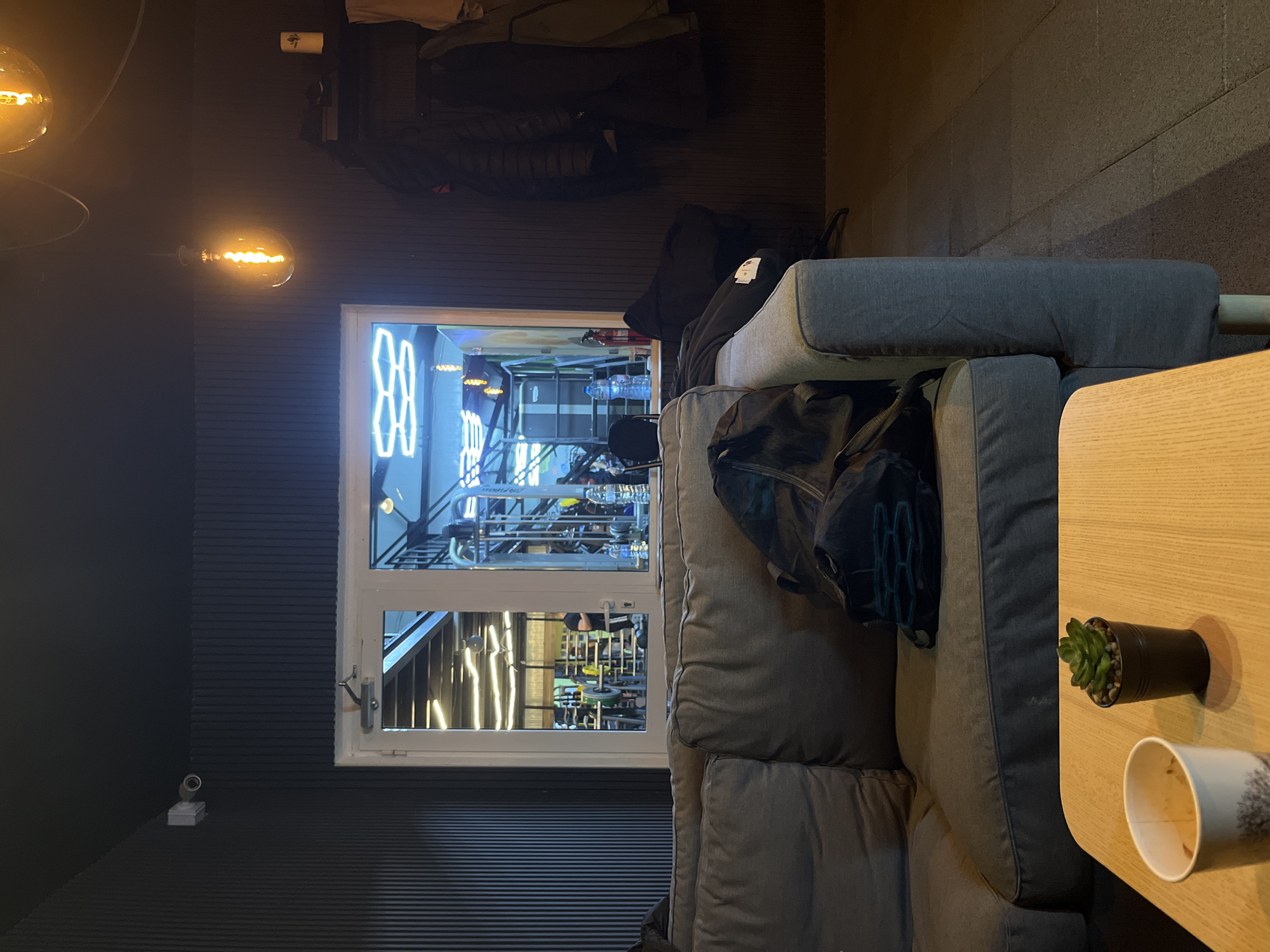 n interior space, possibly a waiting area or lounge, situated in Harmanli, Bulgaria. A grey sofa dominates the foreground, with a black bag casually placed on one of the cushions. A light wood-toned table stands next to the sofa, hosting a small potted succulent and a discarded paper cup with coffee remnants. Behind the sofa, a door or window reveals a fitness center, showcasing exercise equipment such as weight machines and treadmills. The fitness center appears to be active, with people exercising within the facility. The wall adjacent to the door is dark, striped, and minimalist, with a security camera or sensor mounted near the base. A bare-bulb light fixture hangs from the ceiling, contributing to the warm ambient lighting. Above the doorway, coats are hung on the wall. The interior appears modern and clean, indicative of a contemporary fitness environment.