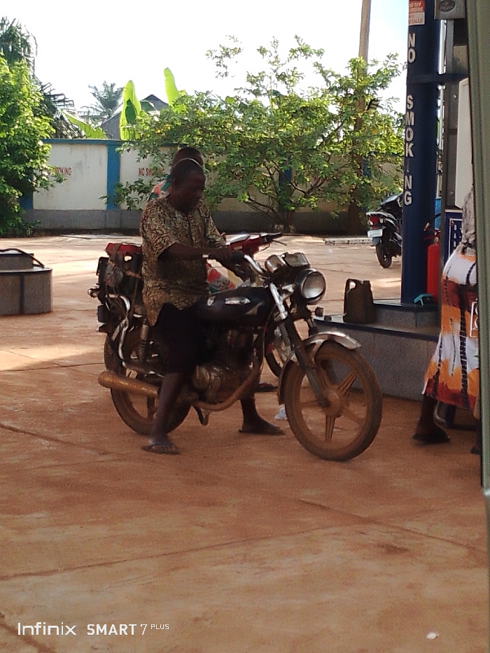 A man in a patterned shirt straddles a black motorcycle. He is wearing dark shorts and sandals. Another person stands nearby in a colorful garment. The scene appears to be a gas station, evidenced by a "No Smoking" sign, a fuel pump, and other motorcycles in the background. The ground is reddish-brown, and lush green trees are visible. The image bears the watermark "Infinix SMART 7 PLUS".
