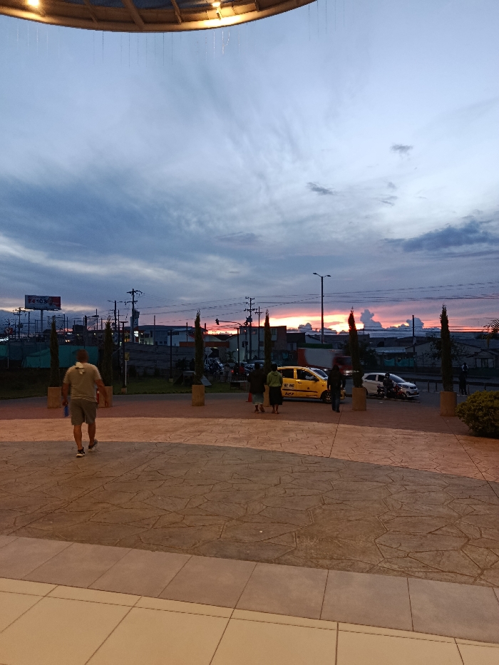The image captures a sunset scene in an urban area. The sky is a mix of blues, grays, and orange hues from the setting sun. Several people are present, including a man walking away from the viewer and others near parked cars and a yellow taxi. Tall, slender trees are planted in pots along the edge of a paved area. Streetlights and power lines crisscross the distant cityscape. The foreground features a patterned concrete surface, possibly a plaza or outdoor area of a building.