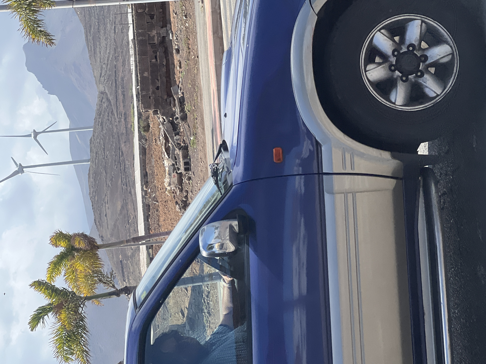 The image depicts a daylight scene in Santa Lucía de Tirajana, Gran Canaria, Spain. The foreground is dominated by the passenger-side front quarter of a two-tone SUV, featuring a dark blue upper body and a silver lower section, positioned on an asphalt road next to a red curb. The vehicle has a chrome side mirror, a chrome side step, an orange fender indicator light, and a six-spoke silver alloy wheel. An adult driver with dark, curly hair, wearing a patterned light-colored short-sleeved shirt and a watch or bracelet on their right wrist, is visible through the driver's window, with their hand on the steering wheel. Beyond the road, an arid, reddish-brown expanse of disturbed earth contains scattered concrete debris and sparse vegetation, with two palm trees and structures resembling agricultural covers further back. The background features rugged, greyish-brown mountains under a partly cloudy sky, with two prominent white wind turbines situated on a distant ridge.