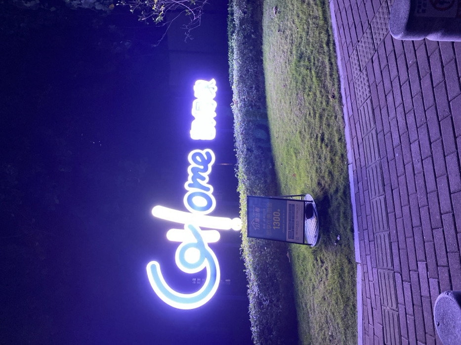 A luminous "City Home" sign with Chinese characters stands beside a manicured lawn. The lawn is adjacent to a brick-paved walkway. A sign displaying "1300" in bold is placed near the "City Home" sign. The lighting in the area casts a bluish-purple hue, contrasting the green grass and the vibrant signage. The image seems to be taken at night.