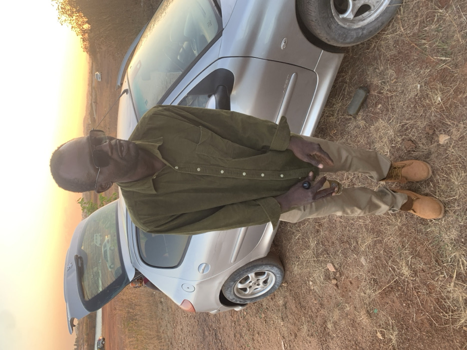 An older man stands next to a silver hatchback car with the trunk open, at an angle. He wears sunglasses, an olive green button-down shirt, tan pants, and brown suede boots. The backdrop is a grassy, dirt-covered field with trees visible in the background and the sun setting. A dark-colored object lies on the ground near the car.