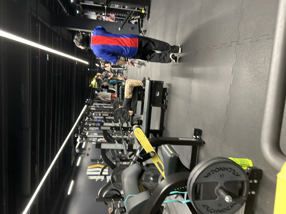 n indoor gym. Several weight machines are lined up, with various users. A person in a blue and red shirt walks down the aisle. The gym has a black ceiling and gray flooring, illuminated by long, linear lights. One person lies on a leg press machine, pushing weights upwards. Circular weights are visible on several machines.