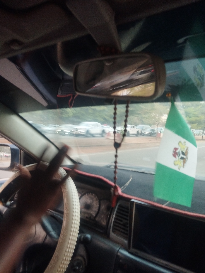 The image captures an interior view from a vehicle in Gwarinpa, Nigeria, looking forward through the windshield