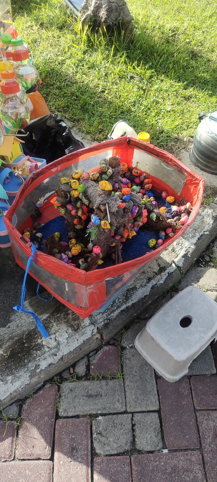 - "A red plastic container with a transparent plastic cover is filled with hundreds of colorful hermit crabs" by FM-UMXfE3, licensed under CC BY 4.0