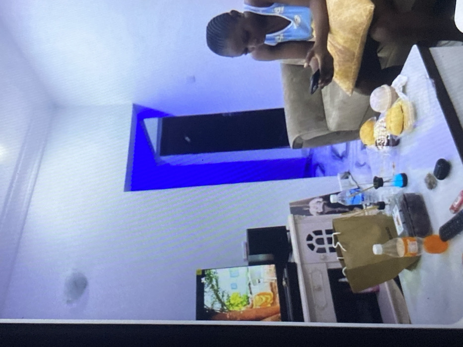 The image depicts a person using a smartphone while seated on a couch with a pillow. A table is positioned in front of the couch, displaying various items including food in a plastic container, water bottles, a brown bag, and other objects. A television sits below the table on a stand, while a doorway with blue lighting is visible in the background. The room is brightly lit, with a white ceiling and walls.