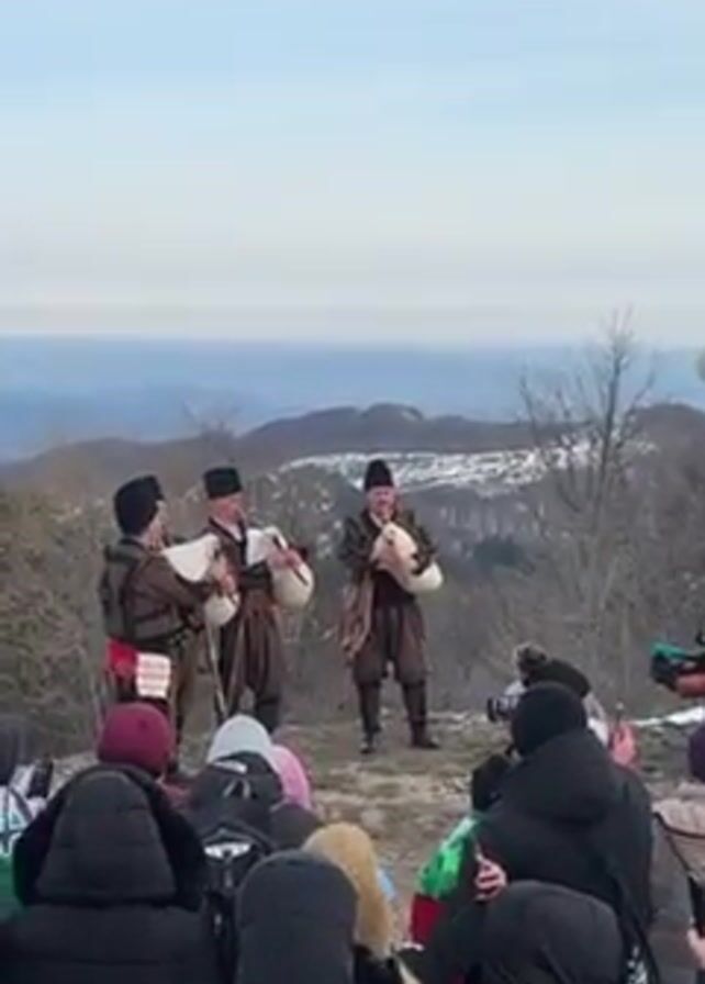 A group of four men in traditional Bulgarian clothing are performing music with bagpipes for a crowd of people gathered on a mountain top