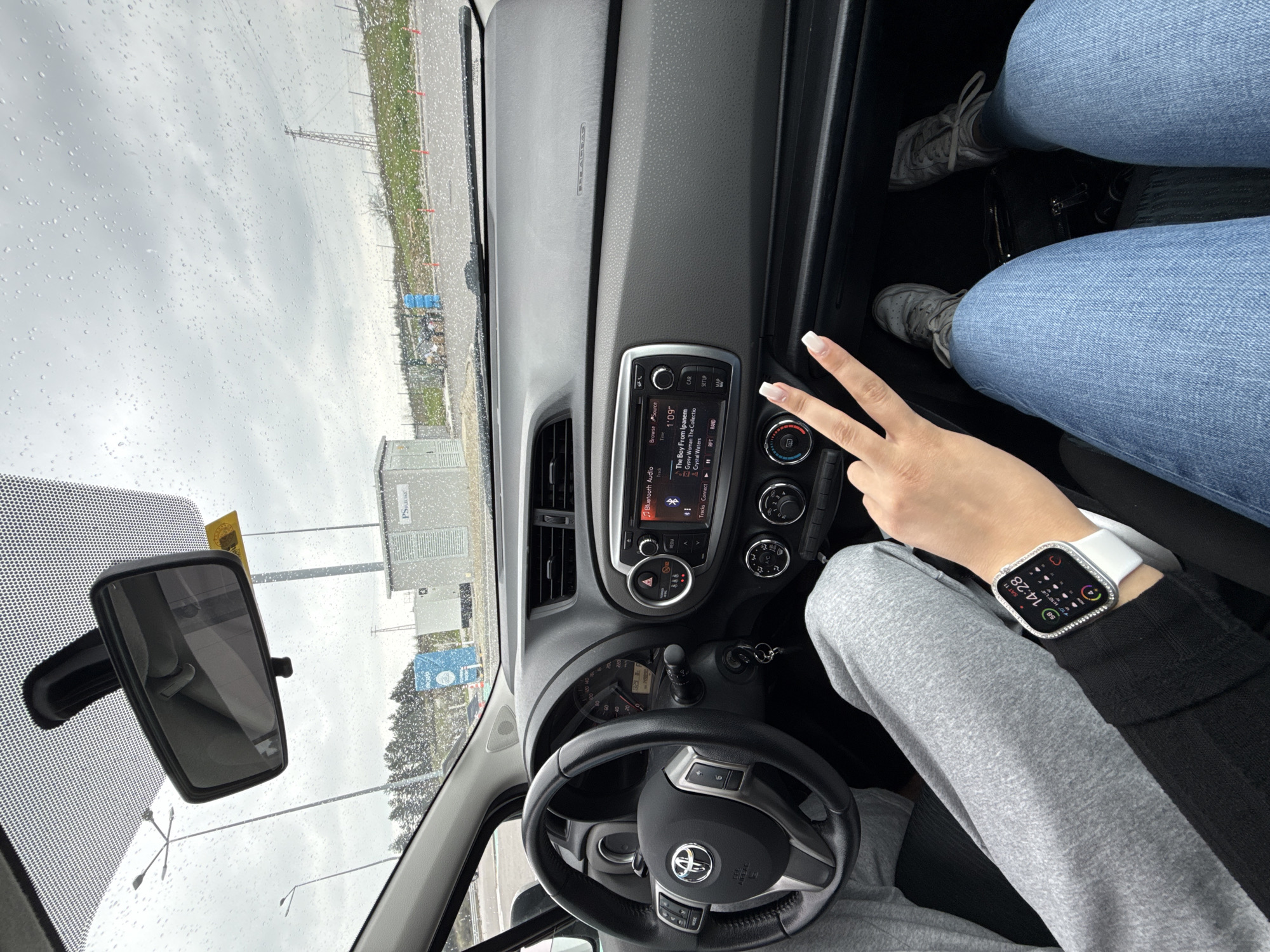 The interior of a car is captured from a slightly elevated, tilted perspective. A steering wheel emblazoned with a Toyota logo is visible, positioned centrally in the lower portion of the frame. A hand with manicured nails gives a peace sign in the right of the frame. The person wears an Apple Watch with a white band on their wrist. Another person, wearing blue jeans and sneakers, is in the top right of the image. The car's dashboard features an integrated radio system displaying information about the currently playing song, "The Boy From Ipanema," and indicating a Bluetooth connection. A rearview mirror is visible in the upper left corner, reflecting the outside environment. Outside the car, the scene appears to be an industrial or storage area with electrical infrastructure present. The sky is overcast and rain streaks the windshield. Given the limited details, the exact location within Yablanitsa, Bulgaria, cannot be definitively identified.