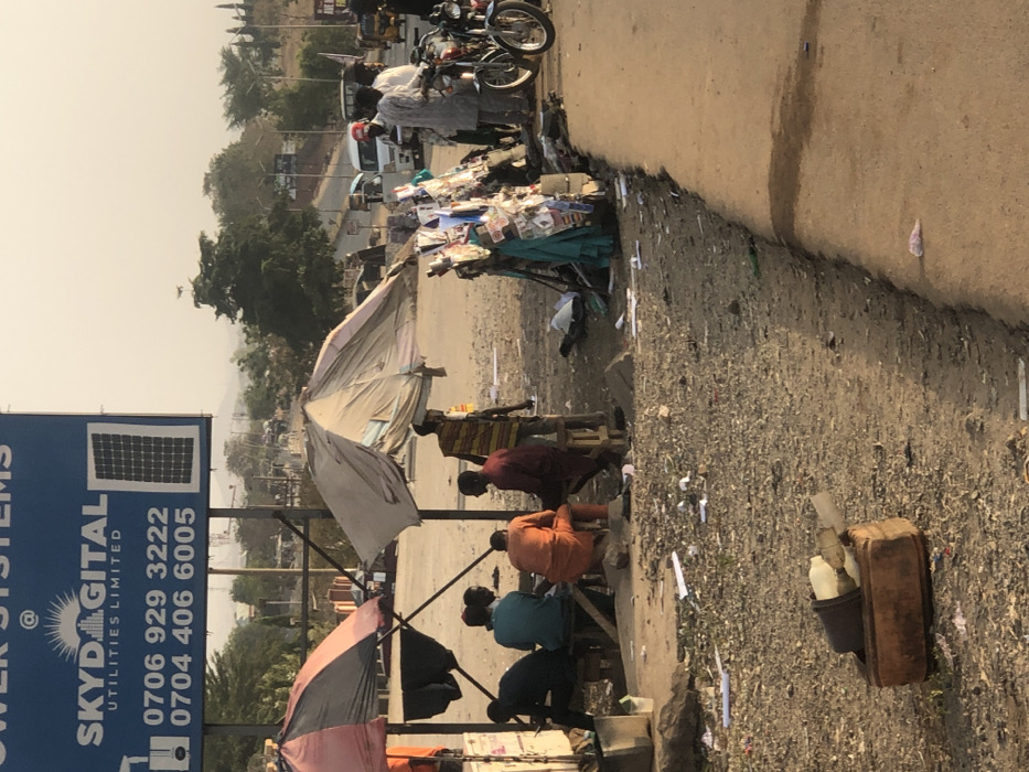 Several people sit beneath makeshift shelters or umbrellas along a roadside. The area appears to be a bustling marketplace or waiting point, evidenced by parked motorbikes nearby. A blue sign with the words "SKYD DIGITAL" and various phone numbers is visible. The overall scene seems to depict a common street setting in a developing area, possibly in Nigeria, given the phone number format. The ground is littered, and the lighting suggests a sunny day.