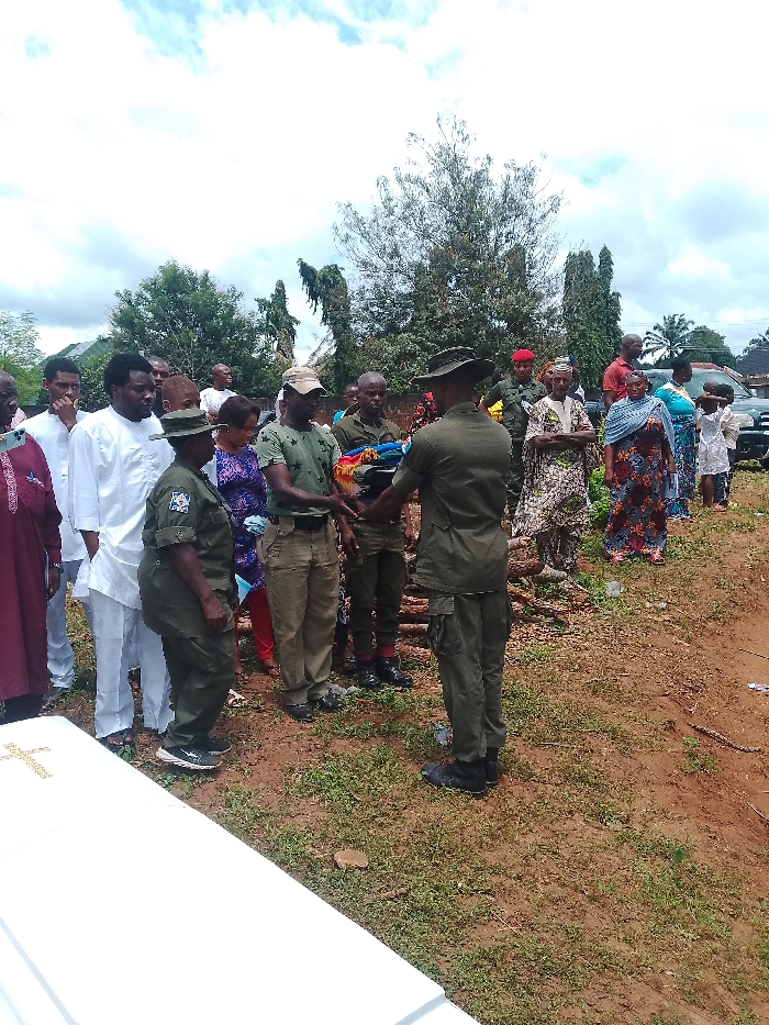 This image depicts a solemn outdoor gathering in Eke, Nigeria, likely a military funeral or remembrance ceremony