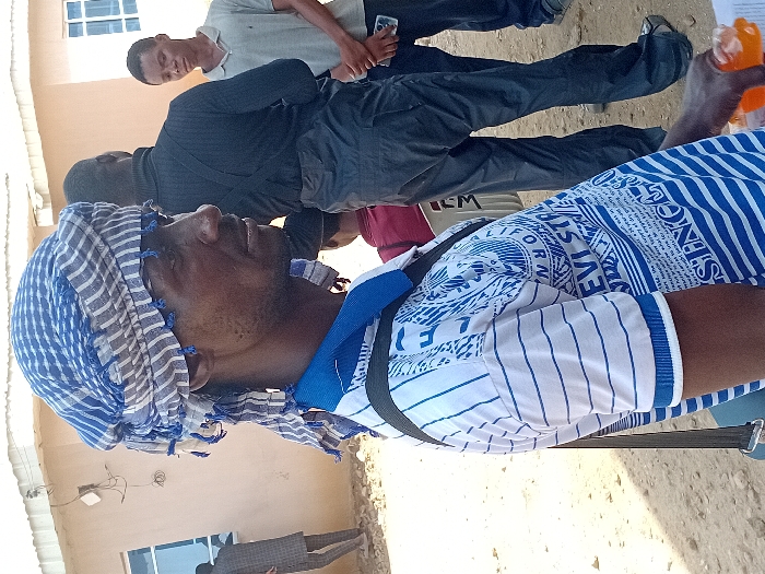 Several individuals are visible outdoors. One person wears a blue and white striped shirt with text and graphics and has a blue and white checkered head covering. He also appears to have a strap or lanyard around his neck. Another person is in the background wearing a light-colored shirt and holding a phone. Additional individuals in dark clothing are partially visible behind the first person. The backdrop includes a building with windows and a sandy or dirt area.