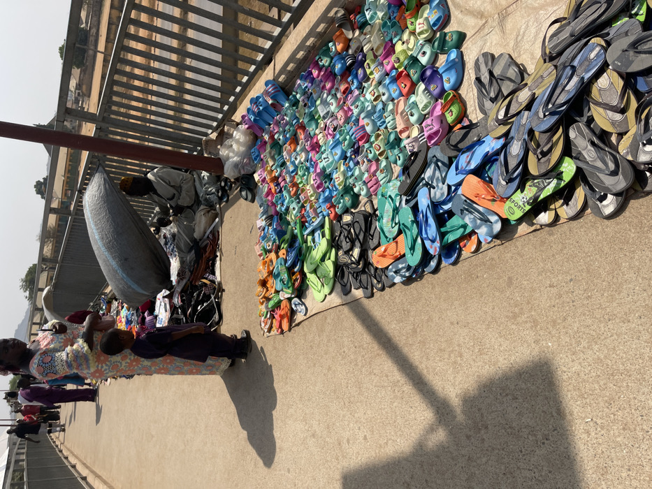 The image depicts an outdoor market scene on a pedestrian bridge in Kuchingoro, Nigeria, under direct sunlight. A diverse collection of brightly colored footwear, including flip-flops, sandals, and children's shoes, is spread across a light-colored ground covering on the right side of the walkway, occupying a significant portion of the pedestrian path. In the mid-ground, a vendor, identifiable as a male wearing light-colored clothing and a skullcap, sits on the ground, partially obscured by a large, dark-colored bag or tarp positioned above him for shade. He appears to be handling merchandise or observing the scene. Adjacent to him are other bundled items and bags, also for sale. To the left, a woman stands upright, dressed in a long, multi-patterned gown. Beside her, a young child, dressed in a dark tunic and trousers, stands facing the merchandise display. Both the woman and child cast distinct, long shadows onto the concrete walkway, indicative of a high sun angle. Further in the background, additional pedestrians are visible walking along the bridge. The bridge itself features metal railings along its right edge. Below the bridge, a semi-urban landscape with buildings and sparse vegetation is discernible in the distance. A reddish-brown metal pole, part of the bridge structure, is prominently positioned in the mid-right. The ground surface is a light-colored, possibly concrete, pavement.