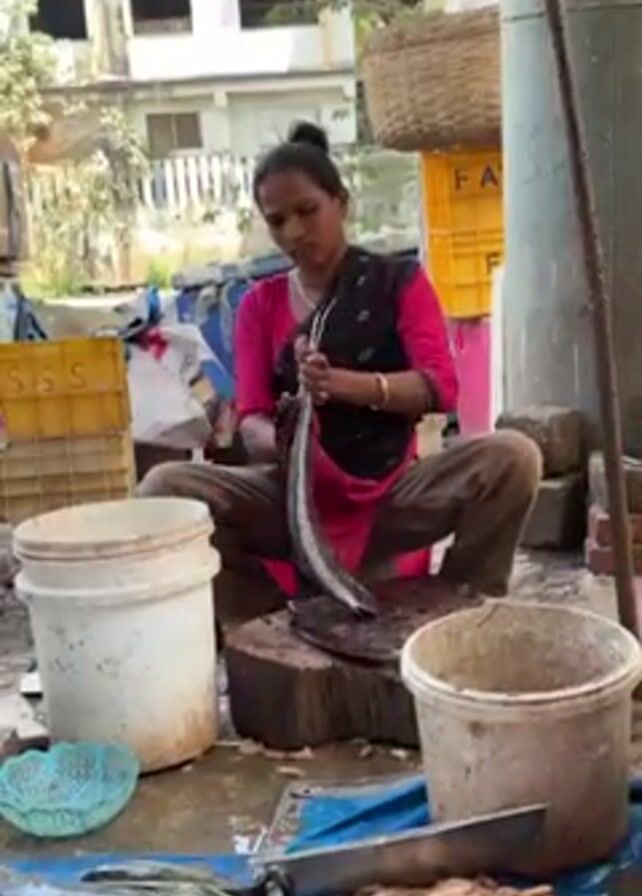 A woman with dark hair in a bun, wearing a pink top, brown pants, and a dark shawl, squats on a brown block and expertly cleans a silver fish at an outdoor market
