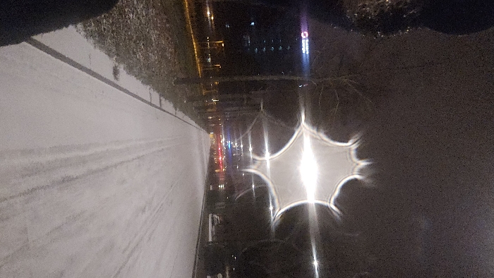 A nighttime scene shows a snow-covered road stretching into the distance. Along the road are streetlights and distant buildings, their lights blurred. A bright, star-shaped light dominates the foreground. The image has a grainy texture and is rotated ninety degrees counter-clockwise.