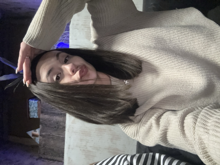 A young adult female is depicted indoors, ostensibly within the city of Radomir, Bulgaria. She is centrally positioned, facing the camera with puckered lips and a small piercing on her left nostril. Her dark brown, shoulder-length hair frames her face. She wears a light beige, chunky knit sweater and a silver-colored cross or 'X'-shaped pendant necklace. Her left hand is raised with fingers splayed across her upper forehead, revealing a ring on her left ring finger and light-colored nail polish. She is seated on a dark, possibly upholstered, surface. To the far left, a portion of another individual's black and white striped clothing is visible. The background consists of a textured, light-colored wall with vertical slatted material above it. The dimly lit environment also shows indistinct angular decorative elements and a blue light source in the upper right.