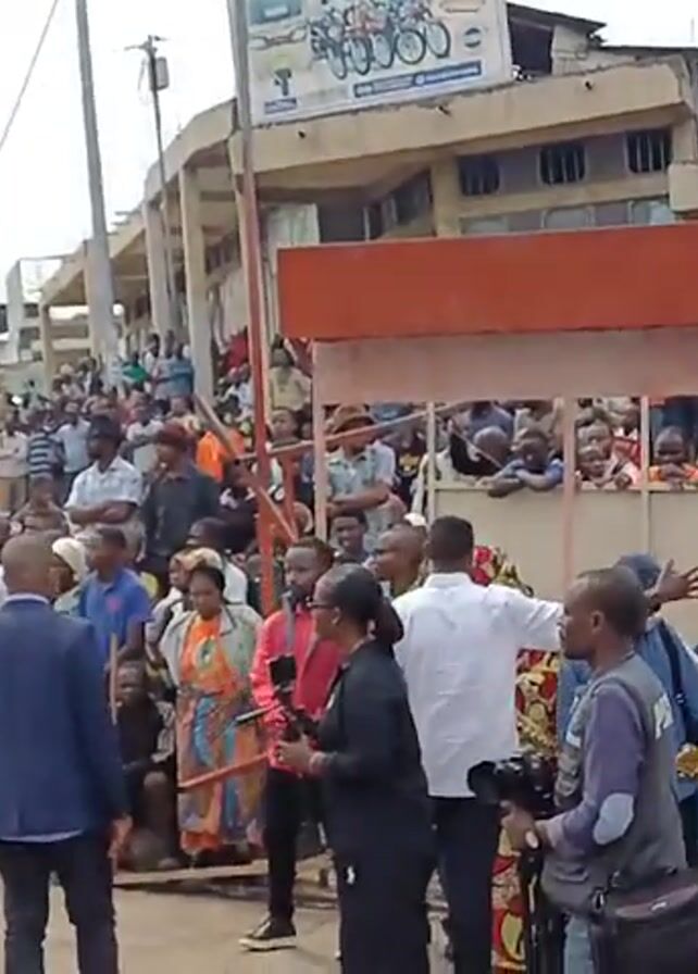 A crowd of people stand on both sides of a road. Several people stand toward the front of the crowd wearing clothes that appear to indicate they are press or media personnel. There is a large building behind them with people looking out the windows and standing on the roof. A utility pole stands tall on the left side of the frame. A white truck is parked further to the left.